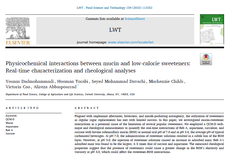 如果您从事饮料制造业研究,请不要错过这篇康奈尔大学食品科学系最近使用QSense耗散型石英晶体微天平分析仪发表的题为《Physicochemical interactions between mucin and low-calorie sweeteners: Real-time characterization and rheological analyses》的文章。