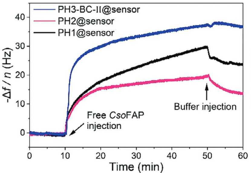 研究团队通过模板蚀刻法制备多孔半透明壳聚糖水凝胶球(PH1),依次进行氨基硅烷化(PH2)和双环状碳酸酯功能化(PH3-BC-II)。利用QCM-D联用技术,在石英晶体表面旋涂不同修饰阶段的载体薄膜(PH1/PH2/PH3-BC-II),实时监测FAP吸附过程: