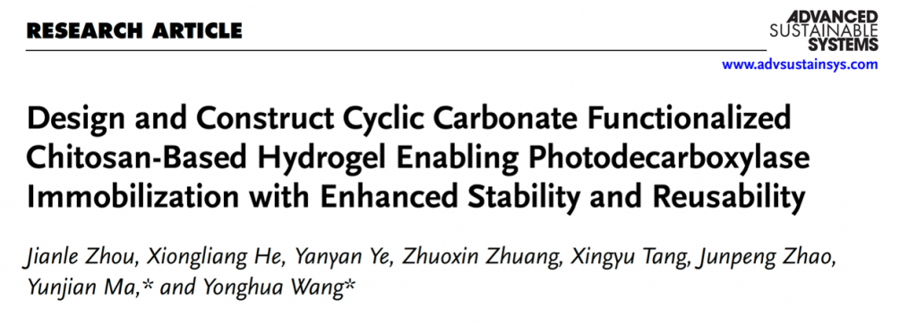 近日华南理工大学王永华团队以“Design and Construct Cyclic Carbonate Functionalized Chitosan-Based Hydrogel Enabling Photodecarboxylase Immobilization with Enhanced Stability and Reusability”为题在《ADVANCED SUSTAINABLE SYSTEMS》上发表相关研究, 本研究创新性地引入环状碳酸酯基团对壳聚糖水凝胶进行功能化修饰,通过共价键固定FAP,并结合耗散型石英晶体微天平技术(QCM-D)实时解析酶-载体相互作用机制,为光酶固定化体系设计提供了新思路。