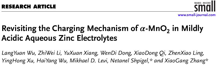 LangYuan Wu, ZhiWei Li, YuXuan Xiang, WenDi Dong, XiaoDong Qi, ZhenXiao Ling, YingHong Xu, HaiYang Wu, Mikhael D. Levi, Netanel Shpigel*, XiaoGang Zhang*. Revisiting the Charging Mechanism of α-MnO2 in Mildly Acidic Aqueous Zinc Electrolytes. Small 2024, 2404583.