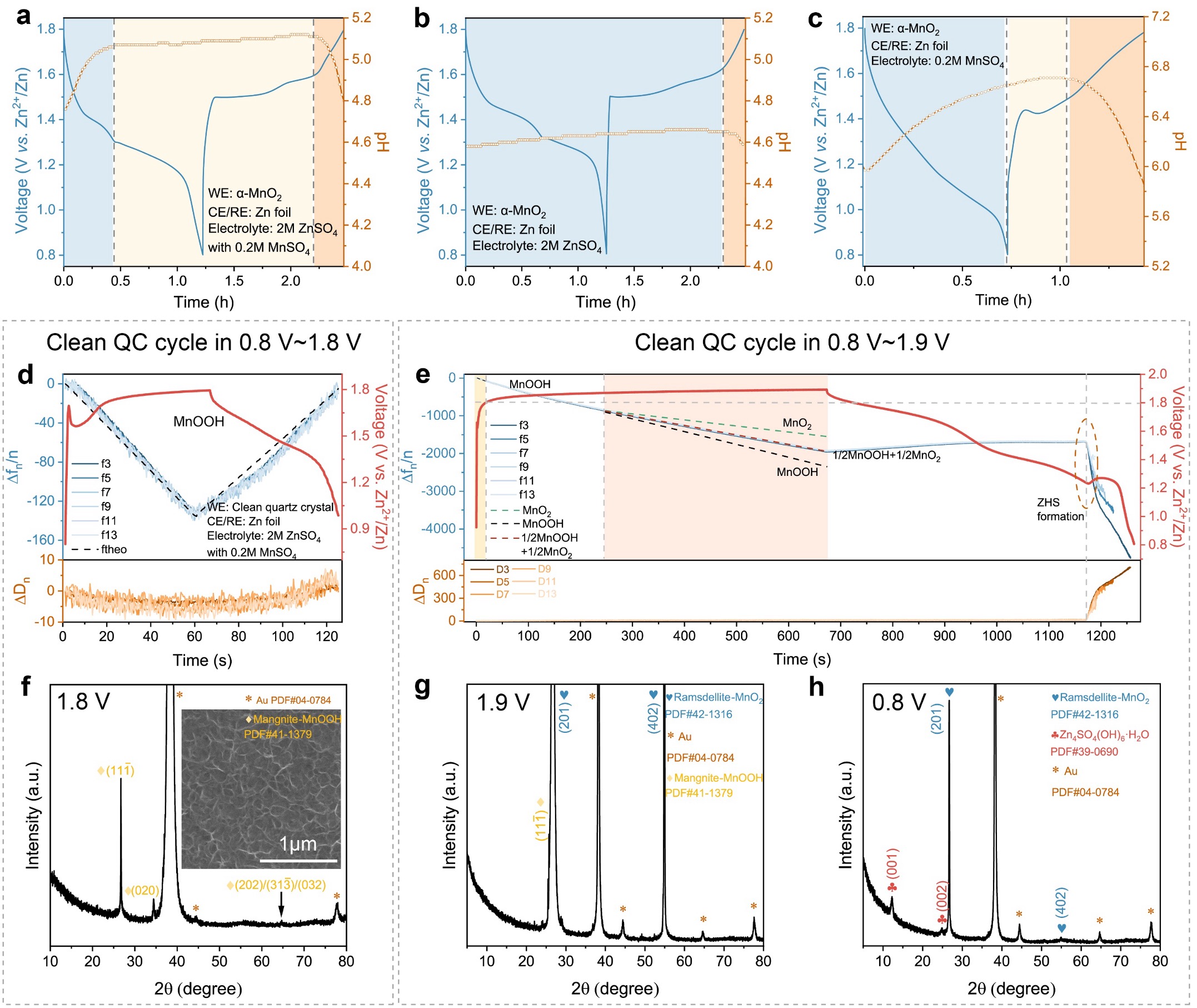 图2.MnSO4添加剂作用分析。a-c) α-MnO2电极分别在2M ZnSO4 + 0.2M MnSO4 (a), 2M ZnSO4 (b), 0.2M MnSO4 (c)电解液中的原位pH测试。d, f) 未涂覆的晶振片在2M ZnSO4 + 0.2M MnSO4电解液中在0.8~1.8V电位区间的EQCM-D测试以及晶振片的XRD测试。e,g,h) 未涂覆的晶振片在2M ZnSO4 + 0.2M MnSO4电解液中在0.8~1.9V电位区间的EQCM-D测试以及晶振片的XRD测试。