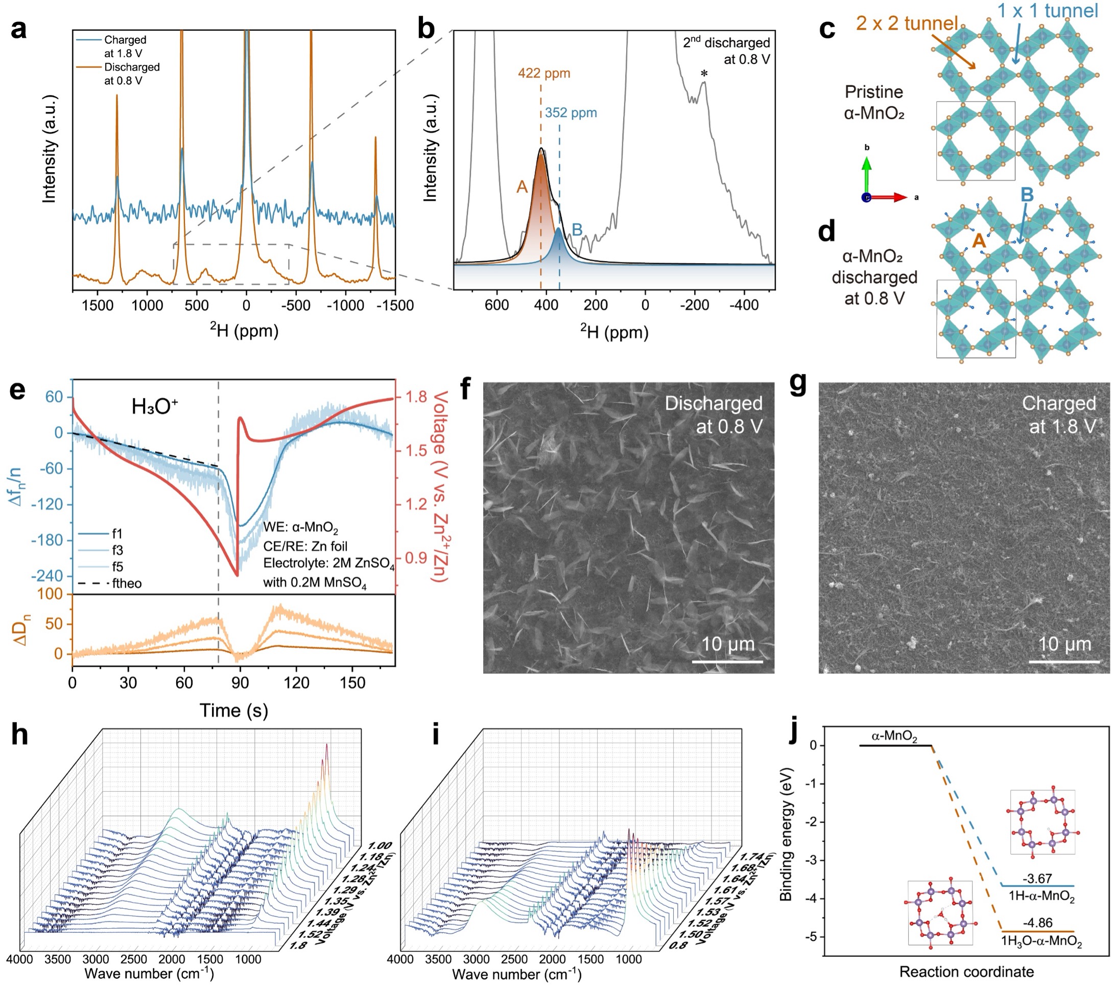 图1.α-MnO2脱嵌水合氢离子H3O+分析。a-b) 第二圈的充电和放电状态极片粉末的固体核磁谱图。c-d) 核磁谱图分峰对应的A位点(422 ppm)和B位点(352 ppm)分别对应α-MnO2隧道的2x2和1x1结构。e-g) 涂覆α-MnO2的晶振片原位EQCM-D测试,在一圈的充放电过程的质量分析以及在放电状态和充电状态下的晶振片表面SEM图,在放电状态可以看到片状ZHS垂直生长于晶振片表面。h-i)原位红外测试的放电和充电过程对应的红外振动变化。i) α-MnO2嵌入脱溶剂化的H+和水合氢离子H3O+结合能分析。